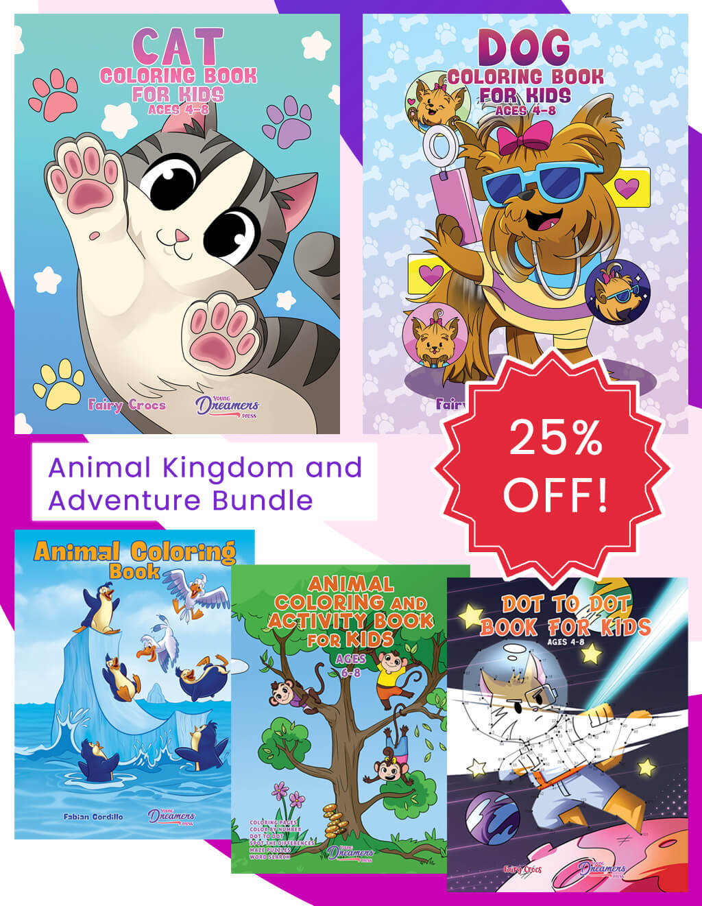 Please note: This bundle consists of one copy each of the books pictured. They include: (1) Cat Coloring Book, (1) Dog Coloring Book, (1) Animal Coloring Book, (1) Animal Activity Book, and (1) Dot to Dot Book for Kids.