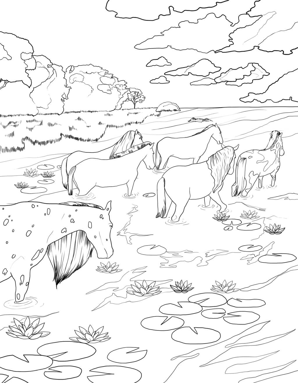 This horse coloring book includes popular breeds like the Gypsy, American Paint, Andalusian, Appaloosa, and Clydesdale. Kids will learn about different horses while they color these detailed drawings. The horse coloring sheets show horses in beautiful outdoor scenes with mountains, forests, and rivers.